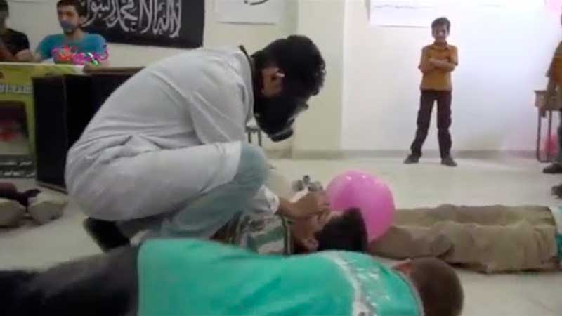 Impresionante vídeo. Una escuela de la ‘zona rebelde’ en Siria, enseña a los niños a simular ataques químicos.
