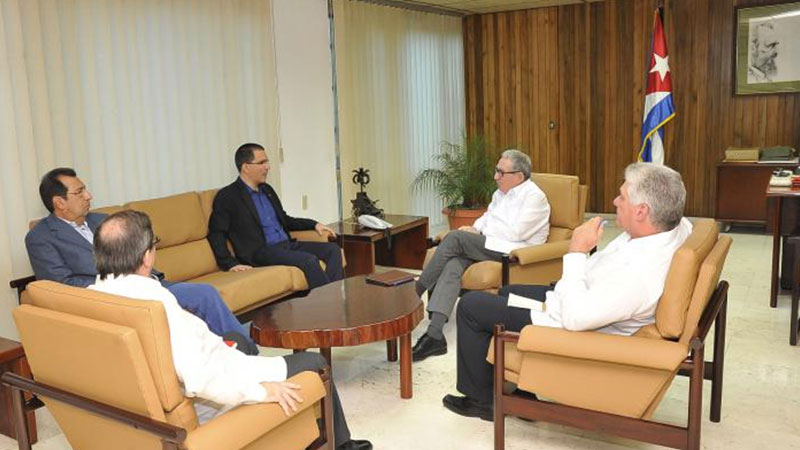 El General de Ejército Raúl Castro Ruz, Primer Secretario del Comité Central del Partido Comunista de Cuba, y el compañero Miguel Díaz-Canel Bermúdez, Presidente de los Consejos de Estado y de Ministros, recibieron en horas de la noche de hoy (día 20) al Canciller de la República Bolivariana de Venezuela, Jorge Arreaza Monserrat, quien preside la delegación de su país al XVIII Consejo Político del ALBA que se celebrará el 21 de mayo, en esta capital.