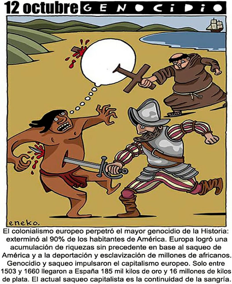 El 12 de octubre marca el inicio del saqueo que hasta hoy sigue empobreciendo a los pueblos de América para llenar las arcas de los saqueadores. Hasta hoy las multinacionales siguen explotando montañas y envenenando ríos, hasta hoy siguen talando bosques y fomentando mercenarios paramilitares para perpetrar masacres contra el pequeño campesinado, con la finalidad de desplazarlo forzadamente de las tierras codiciadas. Hasta hoy sigue el imperialismo europeo y estadounidense urdiendo golpes de Estado (golpe en Brasil, Chile, Argentina, Uruguay, Guatemala, Honduras, desestabilización contra el Estado venezolano, y un largo etc.); hasta hoy sigue el imperialismo urdiendo planes de exterminio contra las y los revolucionarios (Plan Lasso, Plan Cóndor, Plan Baile Rojo, Plan Colombia, Plan Patriota, Plan México, etc.); hasta hoy sigue la injerencia imperialista apuntalando regímenes genocidas como el colombiano, por citar un ejemplo paradigmático de régimen del Terror funcional al saqueo capitalista, mantenido a punta de masacres y exterminio contra la reivindicación social y política de la clase explotada.