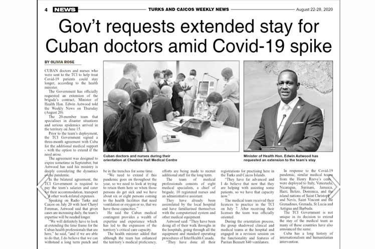 Cockburn Town, 22 ago (Prensa Latina) El gobierno de Islas Turcas y Caicos solicitó ampliar la presencia de la brigada médica de Cuba ‘Henry Reeve’ como refuerzo al enfrentamiento contra la pandemia Covid-19, destacó hoy el diario local Weekly News.
