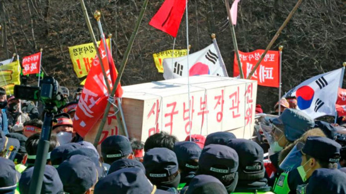 Surcoreanos portan un ataúd simulado para el ministro de Defensa, pidiendo el cierre del campo de tiro de las fuerzas estadounidenses, 4 de febrero de 2021.
