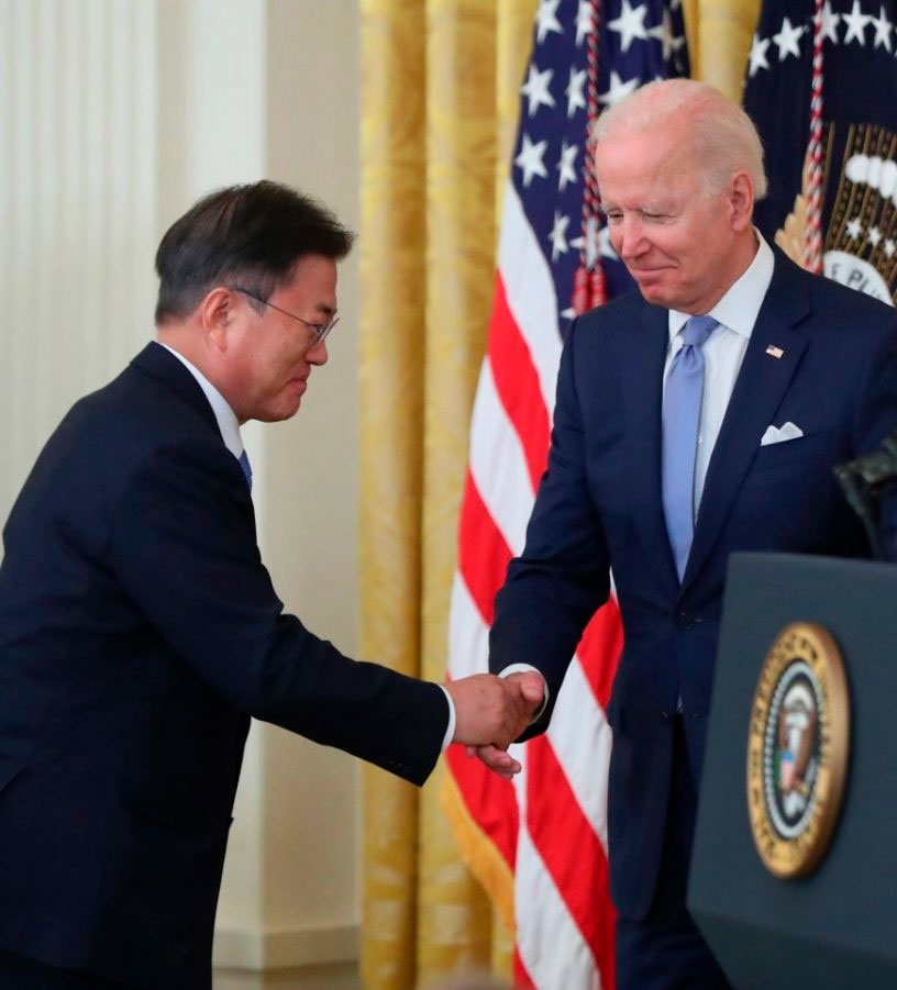 El mandatario surcoreano, que visitó hace poco a EE.UU., anunció en la rueda conjunta de prensa efectuada en el terreno que quedó completada la «guía de misil» EE.UU.-Sur de Corea.