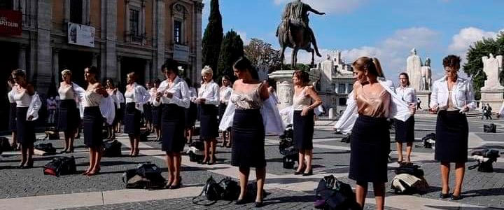 Estas son trabajadoras de Alitalia en esa huelga realizando una protesta en la Plaza Campidoglio, la llamada colina sagrada de Roma. Se quitaron sus uniformes de trabajo y los dejaron en la plaza, donde también está la sede central de Alitalia.