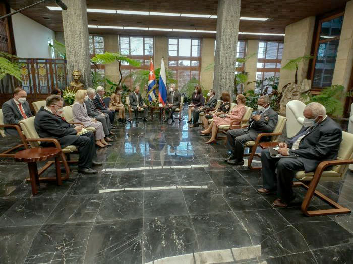 Acompañaron al distinguido visitante, Anna Kuznekova, encargada de negocios de la Embajada de Rusia en Cuba; Iván I. Melnikov, vicepresidente primero de la Duma Estatal; Andrei V. Kartapalov, presidente del Comité de Defensa de la Duma Estatal; Olga V. Timofeeva, presidente del Comité de la Duma Estatal de Desarrollo de Sociedad Civil, Asuntos de Asociaciones Sociales y Religiosas, y Aleksandr V. Shetinin, director del Departamento de América Latina del Ministerio de Relaciones Exteriores.