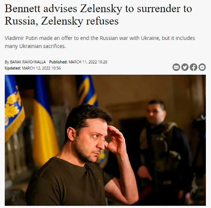 El primer ministro israelí, Naftali Benet, en una conversación con Zelensky, le aconsejó que, para salvar la vida de los ciudadanos ucranianos, aceptara las condiciones de Putin y capitulara.