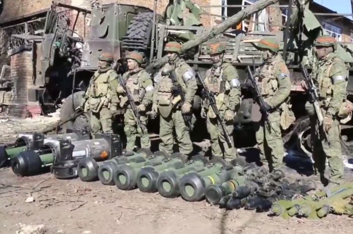 Las fuerzas especiales rusas muestran las armas occidentales incautadas durante la batalla con los nazi-otanistas