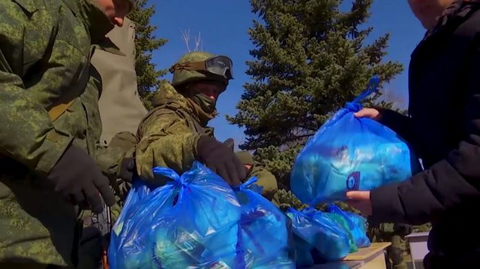 La ayuda humanitaria fue entregada por miembros de las Fuerzas Armadas rusas, acompañados por la policía militar.