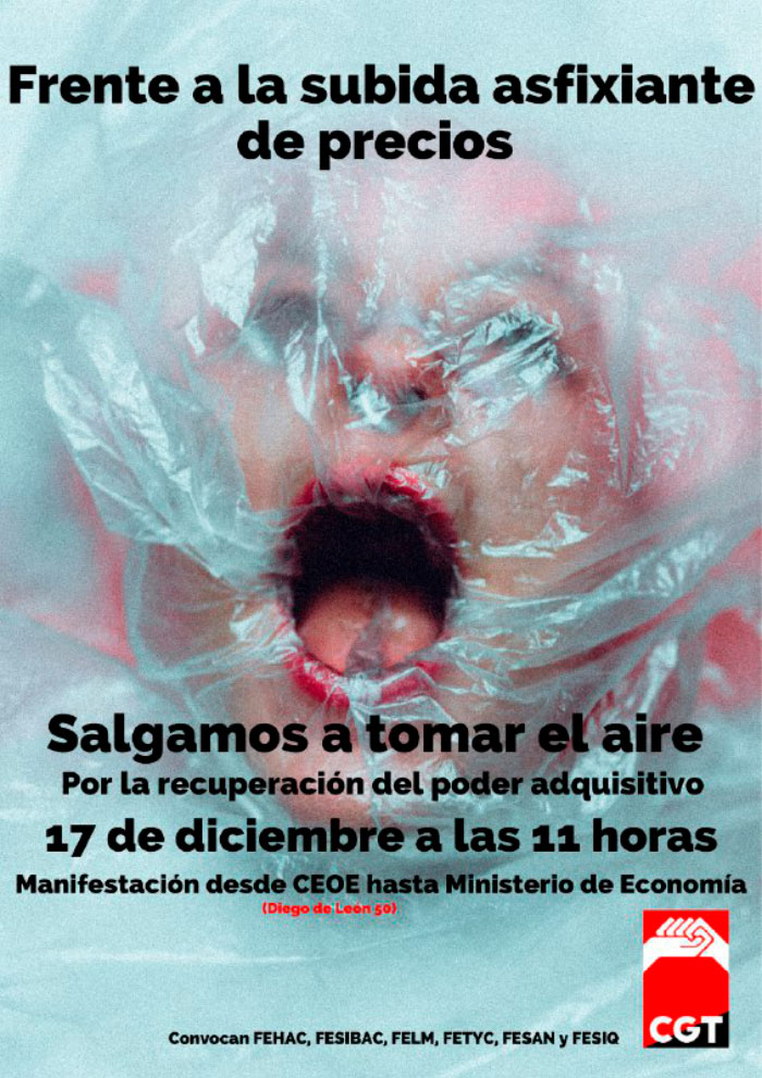 A partir de las 11 horas de la mañana del sábado 17 de diciembre, la CGT ha convocado una manifestación que partirá desde la sede de la CEOE (Calle Diego de León 50) y que finalizará en el Ministerio de Economía. Dos puntos simbólicos y estratégicos que se relacionan estrechamente con el lema de la convocatoria, “Frente a la subida asfixiante de precios, salgamos a tomar el aire. Por la recuperación del poder adquisitivo”, y que pretende dar respuesta a uno de los problemas más acuciantes que está sufriendo la ciudadanía en estos últimos meses. Los precios de los bienes de primera necesidad suben de forma constante mientras que los salarios no llegan a garantizar el IPC.