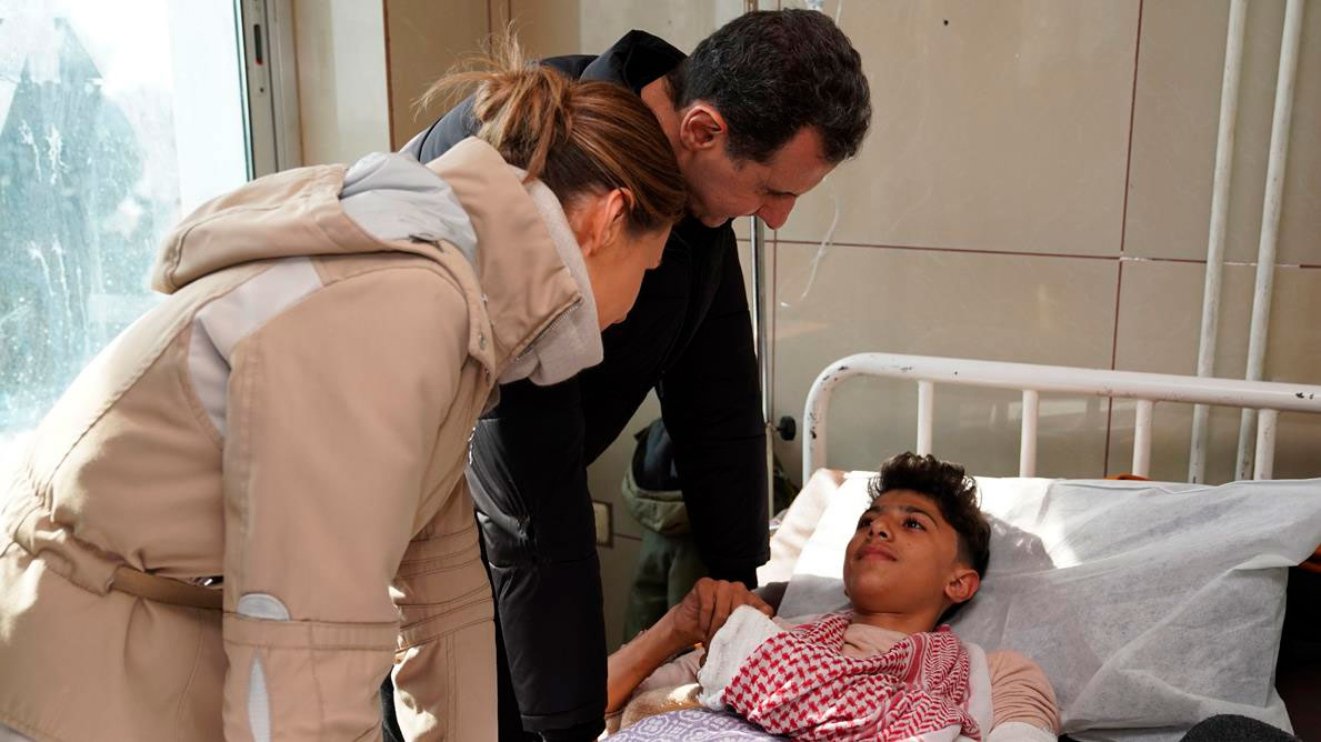 El presidente sirio, Bashar al-Asad, y la primera dama, Asma al-Asad, visitan a víctimas del sismo en el Hospital Universitario de Alepo, 10 de febrero de 2023.