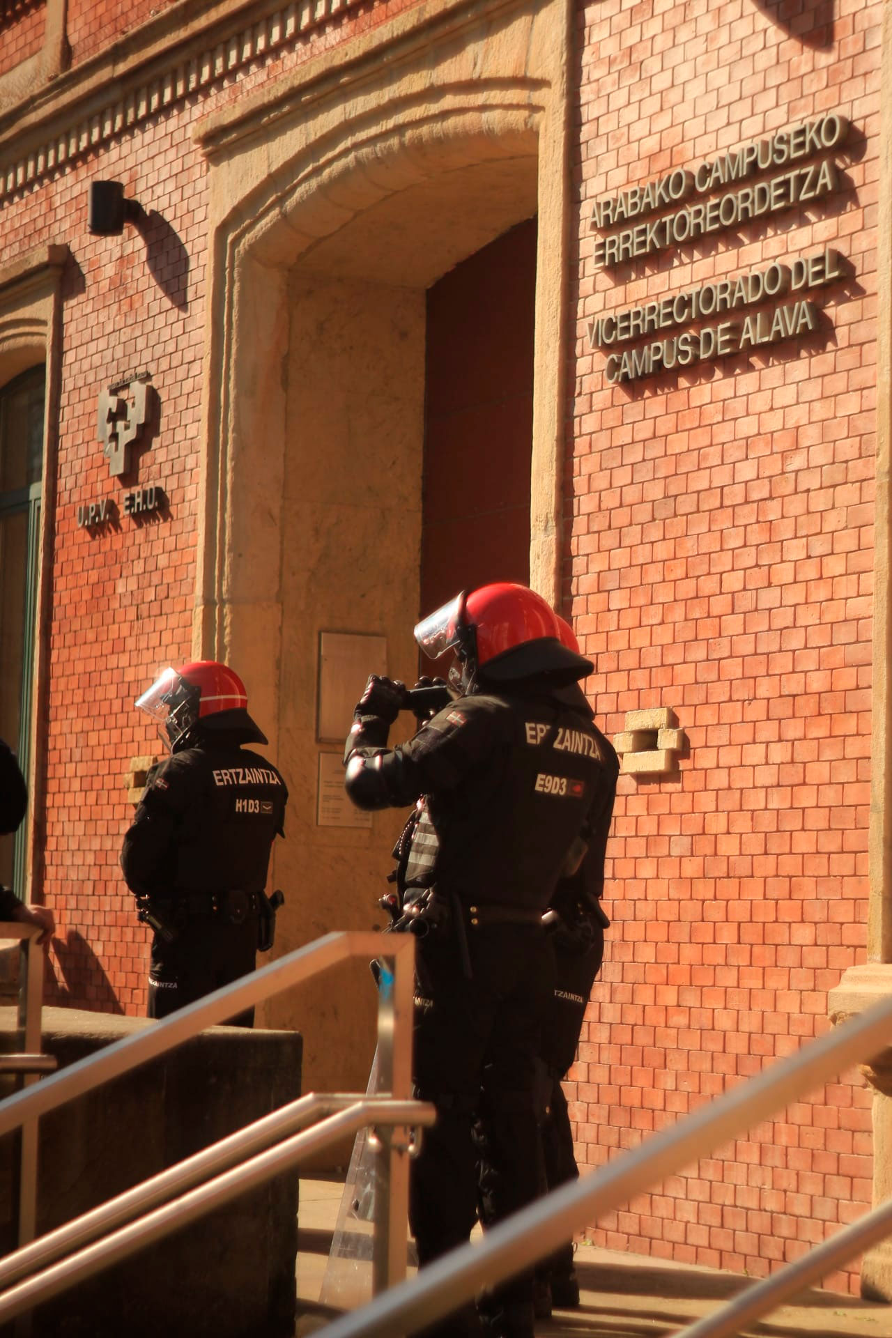 La policía de la burguesía vasca (Ertzaintza) han hecho acto de presencia hoy desde primera hora de la mañana para intervenir y obstaculizar la jornada de lucha. Han denunciado que “en relación con la manifestación, la orden de retirar toda propaganda, la entrada de la policía en el campus, decenas de identificaciones, encontrar las facultades cerradas y barreras de acceso a las facultades, y los registros y el hostigamiento recibido por parte de la seguridad”.
