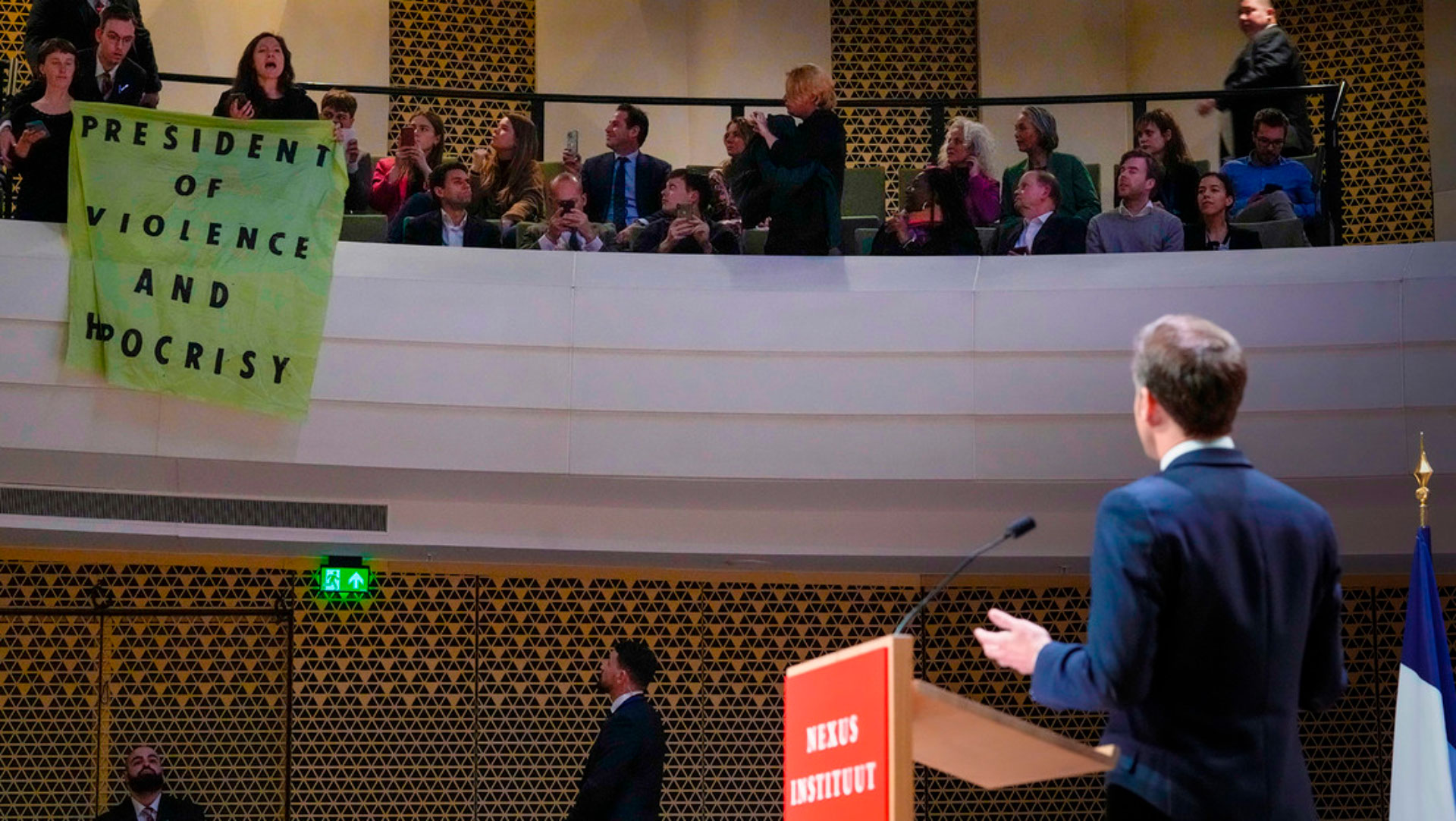 Un grupo de manifestantes ha interrumpido este martes al presidente de Francia, Emmanuel Macron, cuando daba un discurso en un centro de investigación de La Haya (Países Bajos), según se aprecia en un vídeo difundido por medios locales.