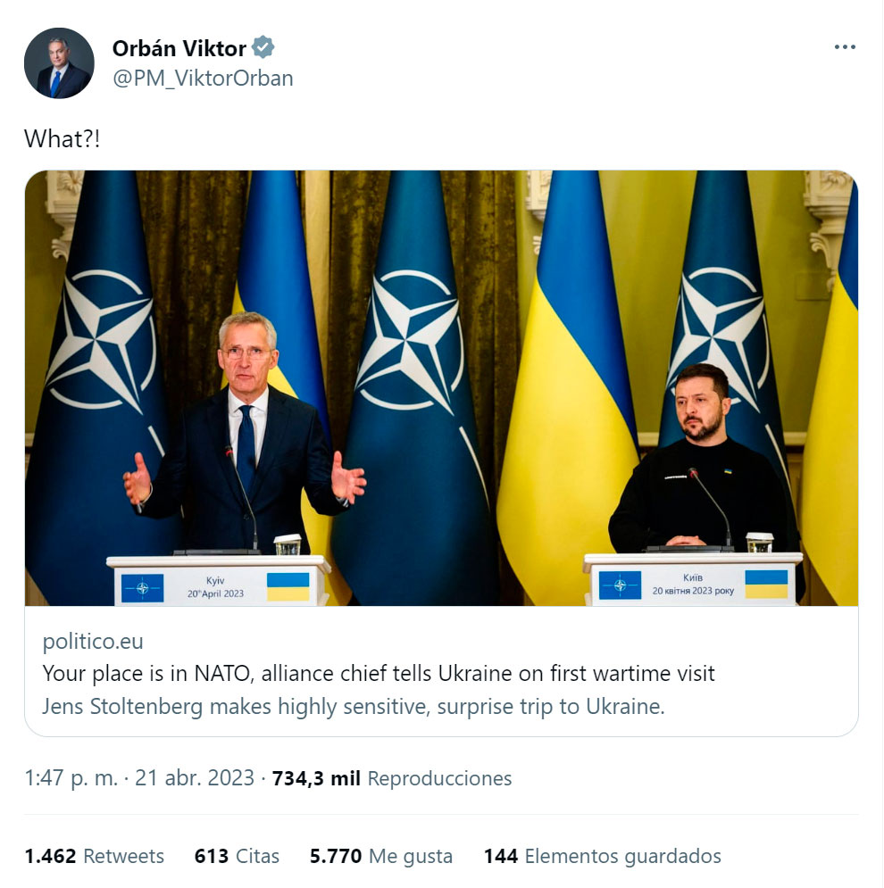 «¡¿Qué?!», escribió este viernes Orbán en su cuenta de Twitter al comentar las declaraciones de Stoltenberg.