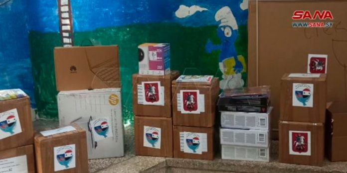 Una delegación de la Organización de Veteranos Rusos “Hermandad en la Lucha” entregó computadoras, impresoras, un tablero electrónico interactivo y libros educativos, a la Escuela “Nazir Nabaa” de Estudiantes Sobresalientes, en Damasco, la capital siria.
