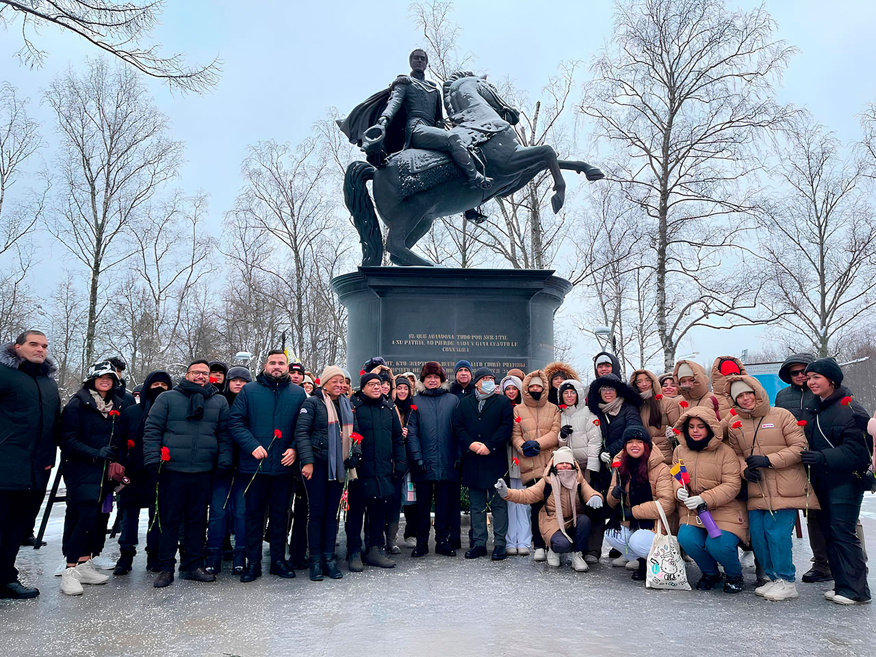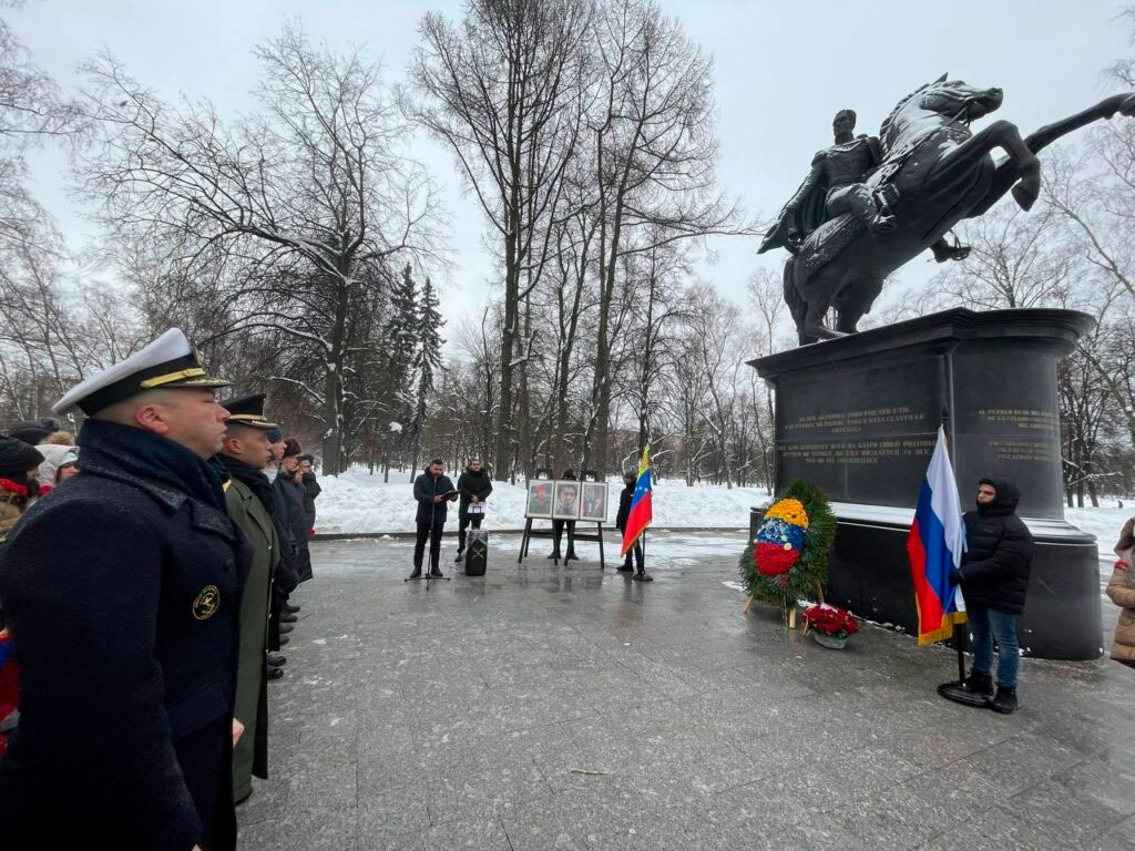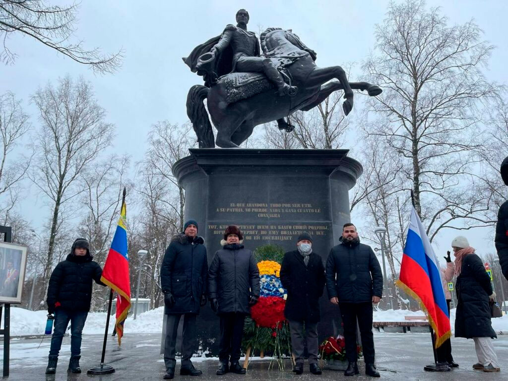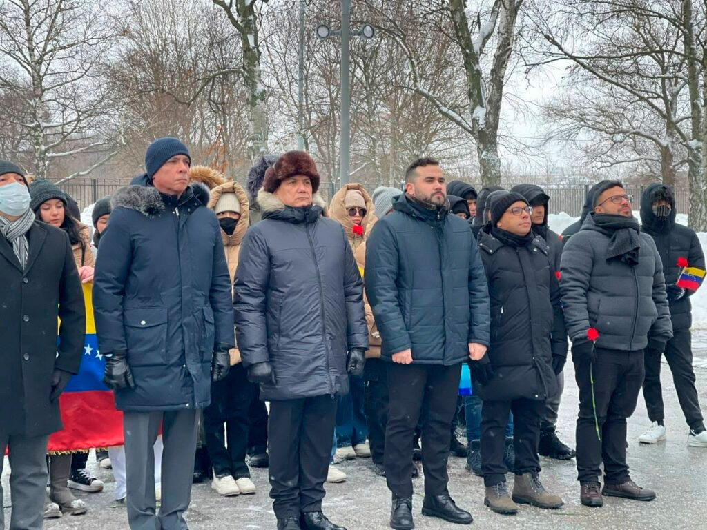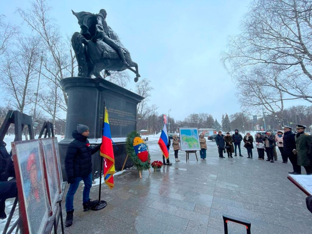 Embajada de Venezuela en Rusia.— Ante el imponente monumento al Libertador Simón Bolívar en la ciudad de Moscú, este domingo 17 de diciembre el embajador de la República Bolivariana de Venezuela, MG. Jesús Salazar Velásquez, en compañía de los embajadores de Colombia y República Dominicana, diplomáticos latinoamericanos, estudiantes venezolanos y representantes de los movimientos de solidaridad, conmemoraron los 193 años de la partida a la inmortalidad del Libertador Simón Bolívar.