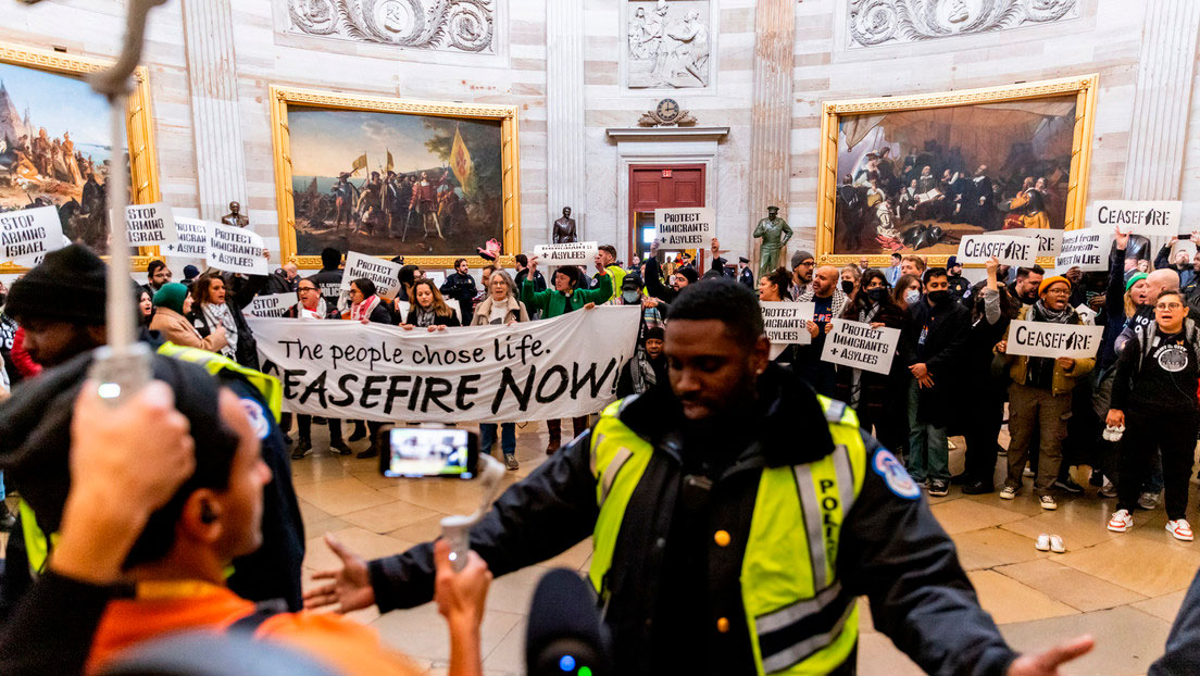 La Policía del Capitolio yanqui detuvo a decenas de personas que se encontraban manifestando este martes en el interior del edificio para exigir un alto al fuego permanente en la Franja de Gaza, así como la interrupción de la ayuda estadounidense a Israel, informa The Washington Post.