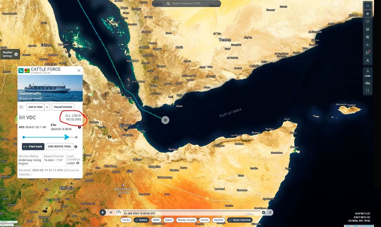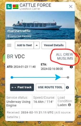 Es la identificación del barco, su origen, su destino, su posición. Y lo más importante, lo que está en el círculo rojo: «Toda la tripulación es musulmana». Os lo pongo en grande, para que no haya dudas.