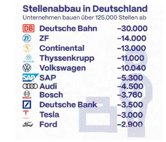No es una situación que atraviese solo Volkswagen, sino otras muchas empresas emblemáticas, lo que ya os he comentado en varias ocasiones, la penúltima hace un mes. Para que se pueda visualizar el desastre que es hoy Alemania, aquí tenéis un cuadro de los despidos que se han producido solo este año.