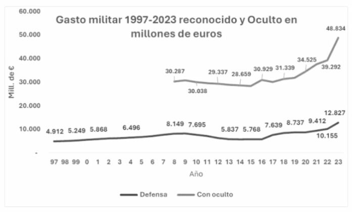 Las cifras oficiales ocultan el gasto militar encubierto y oculto en las partidas de otros ministerios. Por ejemplo, el presupuesto del Ministerio de Defensa para este año fue 16.150 millones de euros, pero el gasto militar ejecutado en 2024 superará los 60.000 millones de euros, situándolo cerca del 6% del PIB2.