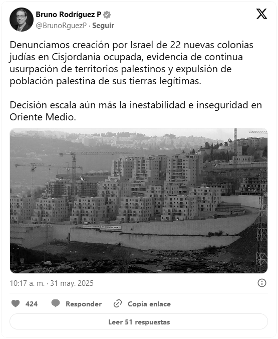 «Denunciamos la creación por Israel de 22 nuevas colonias judías en Cisjordania ocupada», denunció el jefe de la diplomacia cubana por medio de un mensaje en X.