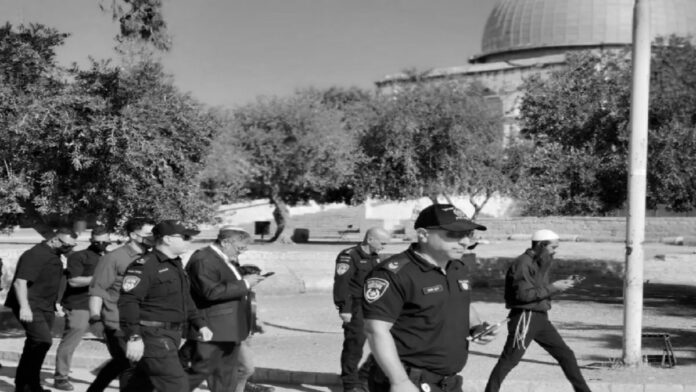 Ben Gvir y los colonos realizaron rituales talmúdicos mientras eran custodiados por las fuerzas de ocupación, violando acuerdos de larga data sobre el estatus de la mezquita y su respeto por la comunidad judía. Foto: Al Mayadeen