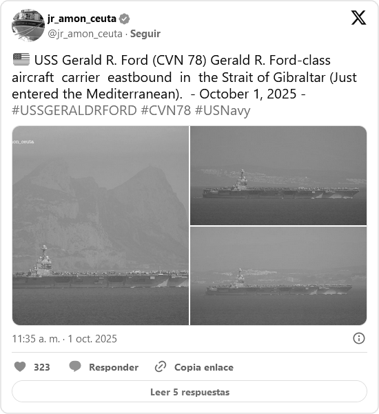 El traslado del buque al mar Mediterráneo oriental se produce en medio de los esfuerzos de Donald Trump de poner fin al conflicto entre Hamás e Israel en la Franja de Gaza y sus amenazas contra el grupo palestino. El presidente de EE.UU. afirmó el martes que Hamás «pagará en el infierno» si rechaza su recién anunciado plan de 20 puntos para acabar con el conflicto Gaza.