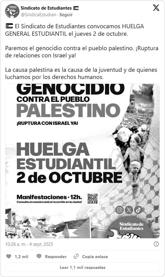 Este jueves 2 de octubre se vivieron movilizaciones en España e Italia en respuesta a la interceptación de la Flotilla Global Sumud en aguas internacionales, cuando se dirigía a Gaza con ayuda humanitaria. La jornada estuvo marcada por huelgas estudiantiles, marchas y ocupaciones en universidades, a las que se sumaron convocatorias sindicales de paros generales.