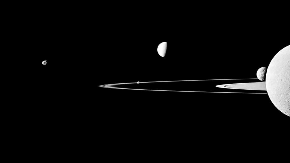 En el polo sur de Encélado, la sonda Cassini descubrió géiseres que brotaban de grietas, lanzando al espacio partículas de hielo diminutas. Una parte de estos granos vuelve a cubrir la superficie de la luna, mientras que la otra escapa para formar el anillo E de Saturno.