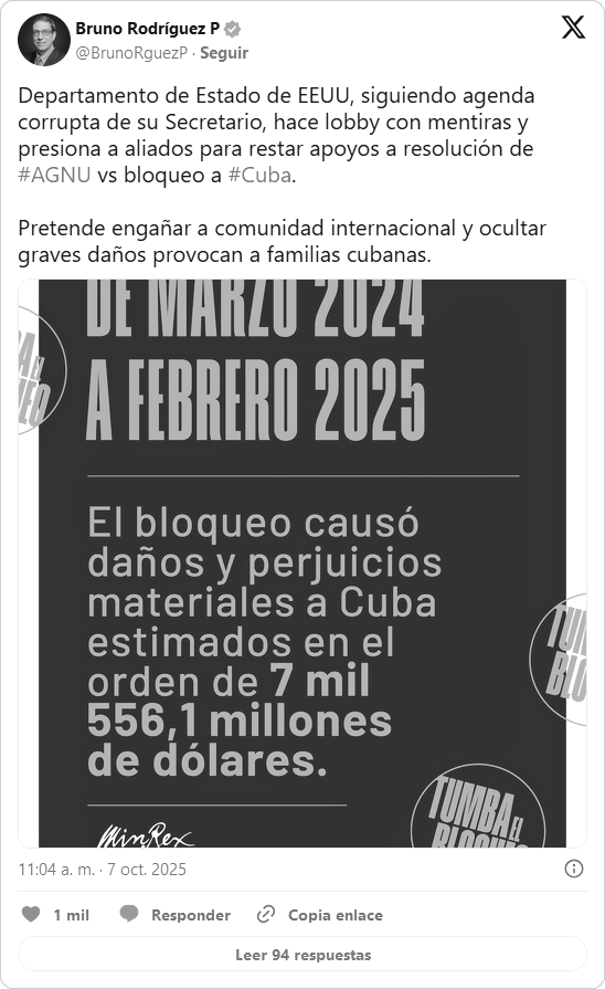 “El Departamento de Estado, siguiendo la agenda corrupta de su secretario Marco Rubio, hace lobby con mentiras y presiona a aliados para restar apoyos a la resolución de la AGNU contra el bloqueo”, escribió Rodríguez en la red social X.
