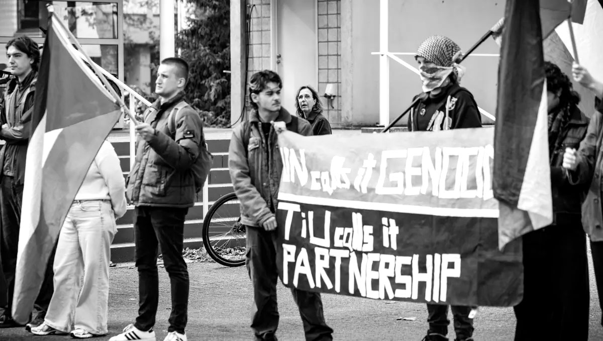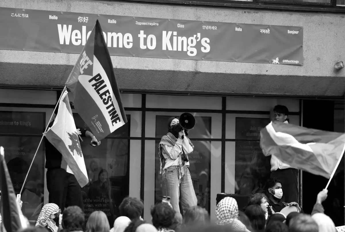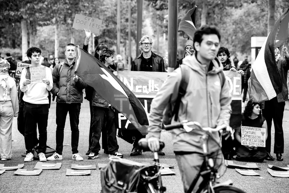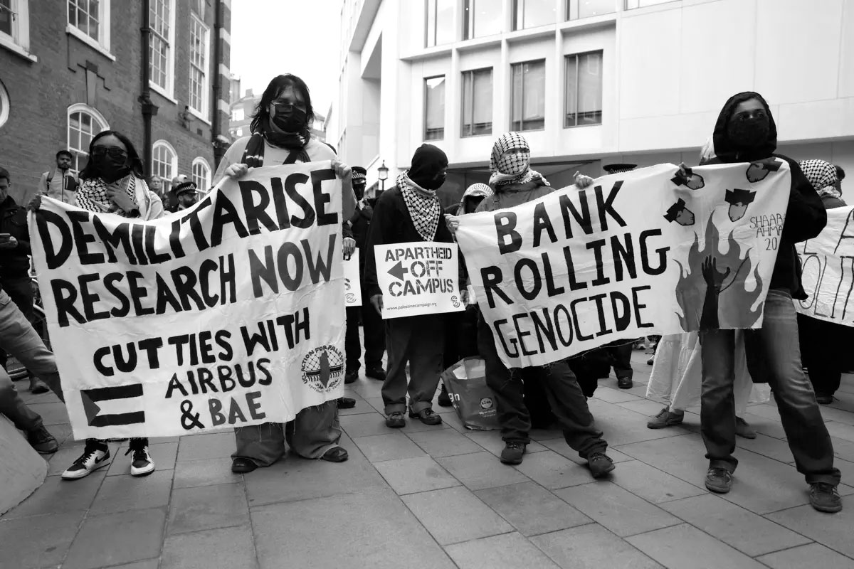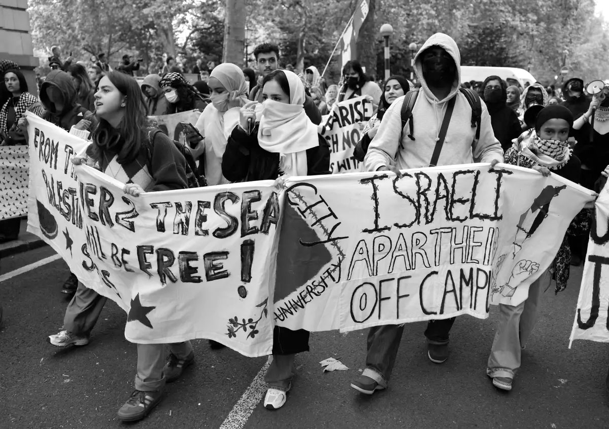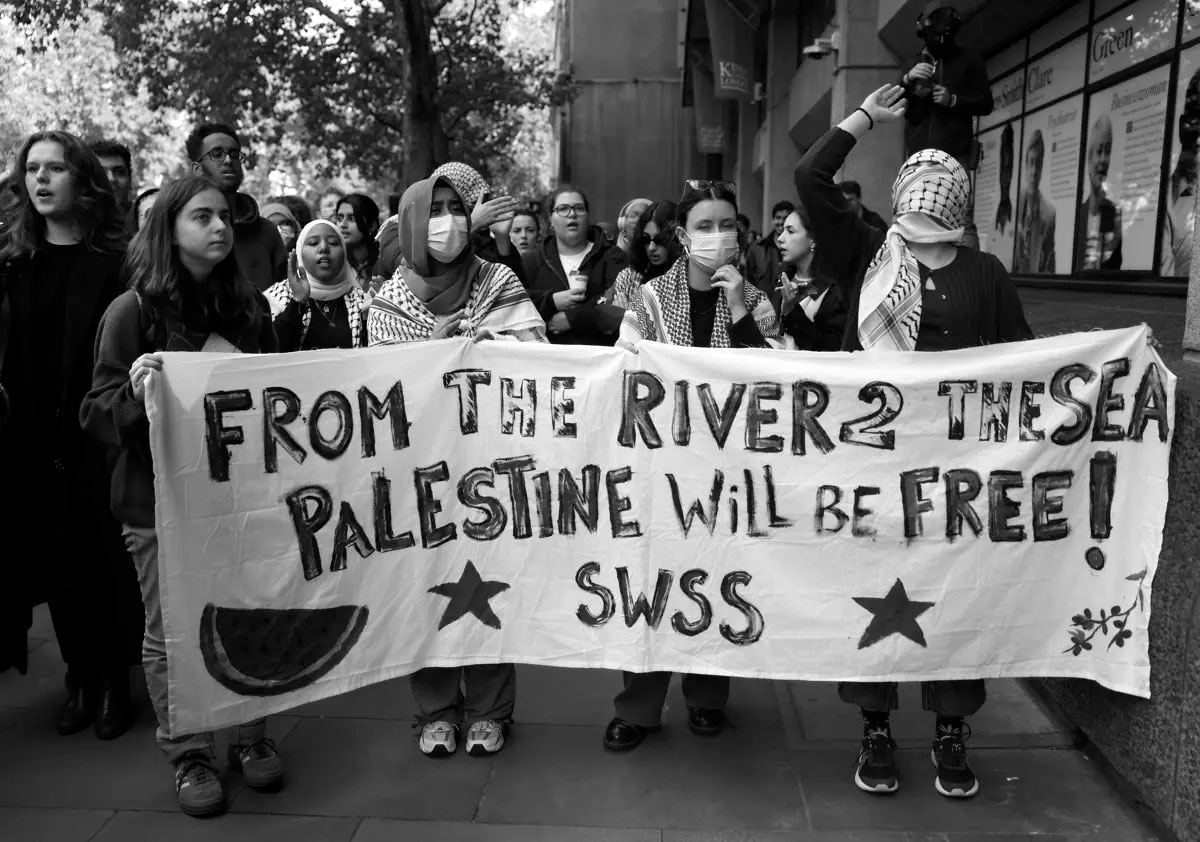 En Londres, estudiantes de King’s College y otras universidades marcharon con kufiyas y pancartas de “Palestina libre”.