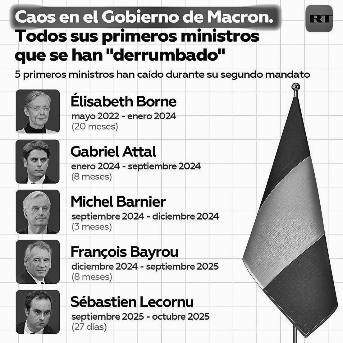 Lecornu fue el quinto jefe del Gobierno desde 2022, cuando Macron inició su segunda presidencia. Con solo 27 días en el cargo, se convirtió así en el primer ministro más breve de la historia de la Quinta República francesa, establecida en 1958.