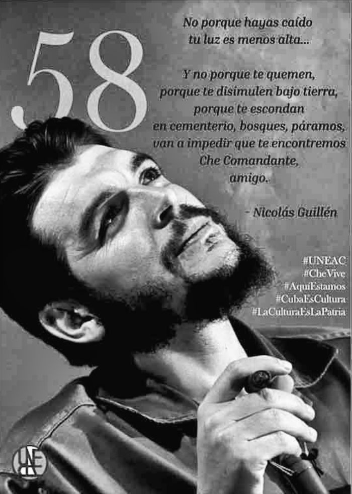La Unión de Escritores y Artistas de Cuba (Uneac) recordó a través de su sitio oficial en Facebook el aniversario 58 del asesinato en Bolivia de Ernesto Che Guevara.