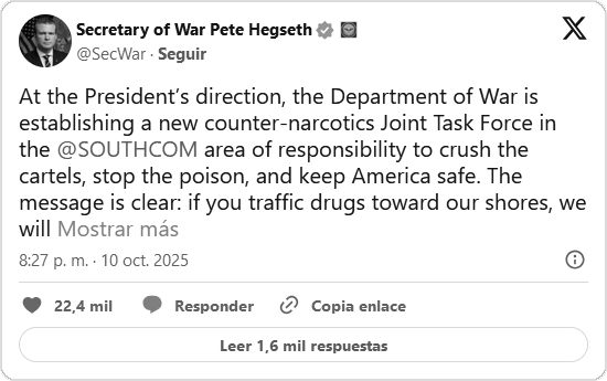 “Por orden del presidente, el Departamento de Guerra está estableciendo una nueva Fuerza de Tarea Conjunta antinarcóticos en el área de responsabilidad del Comando Sur para aplastar a los cárteles, detener el veneno y mantener la seguridad de Estados Unidos”, refrió el secretario de Guerra, Pete Hegseth.
