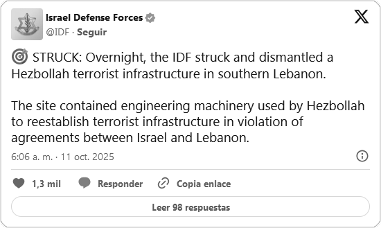 “Las Fuerzas de Defensa de Israel (FDI) atacaron recientemente, lideradas por el Comando Norte a través de la Fuerza Aérea, infraestructura perteneciente a la organización terrorista Hezbolá, que almacenaba herramientas de ingeniería utilizadas para reconstruir infraestructura terrorista en el sur del Líbano”, indicó el ejército israelí a través de su cuenta en X.