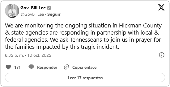 El gobernador de Tennessee, Bill Lee, expresó condolencias en redes sociales: «Nuestros corazones están con todos los afectados por la explosión en Accurate Energetic Systems en McEwen».