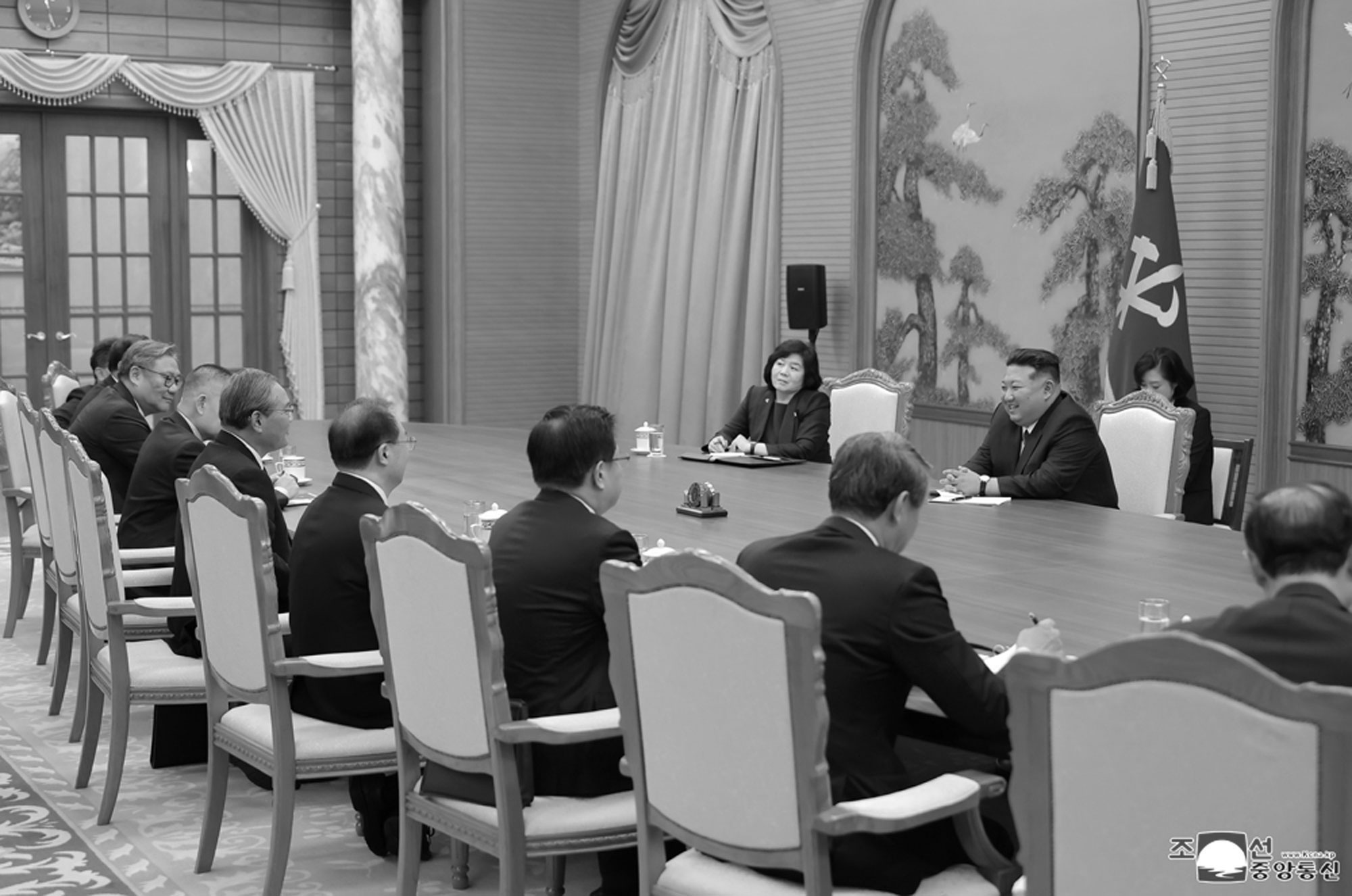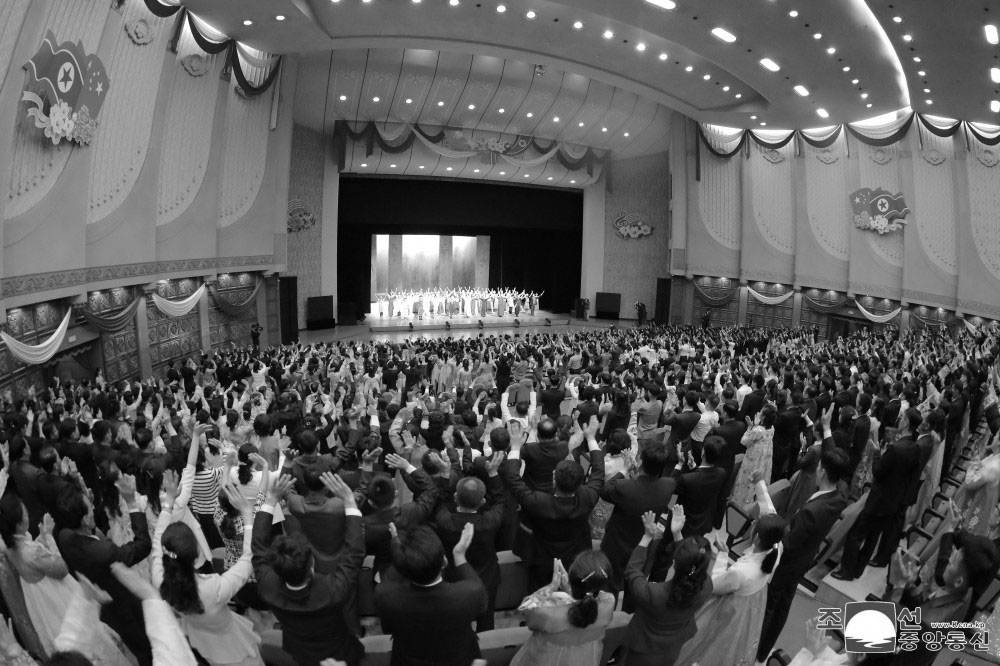 Se ven también los miembros principales del conjunto artístico de Shanghai de China encabezado por el ministro de Cultura y Turismo de la República Popular China, Sun Yeli, y los integrantes de la embajada china acreditada en la RPDC.