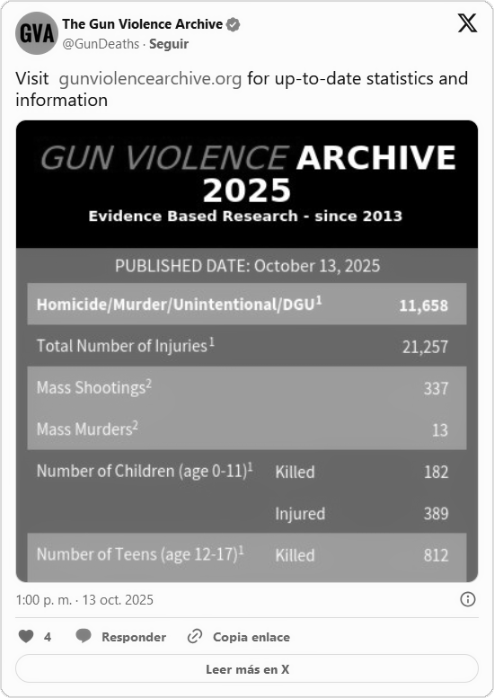 Según la organización no gubernamental Gun Violence Archive (GVA), hasta el 11 de octubre de 2025, Estados Unidos registra 337 tiroteos masivos.