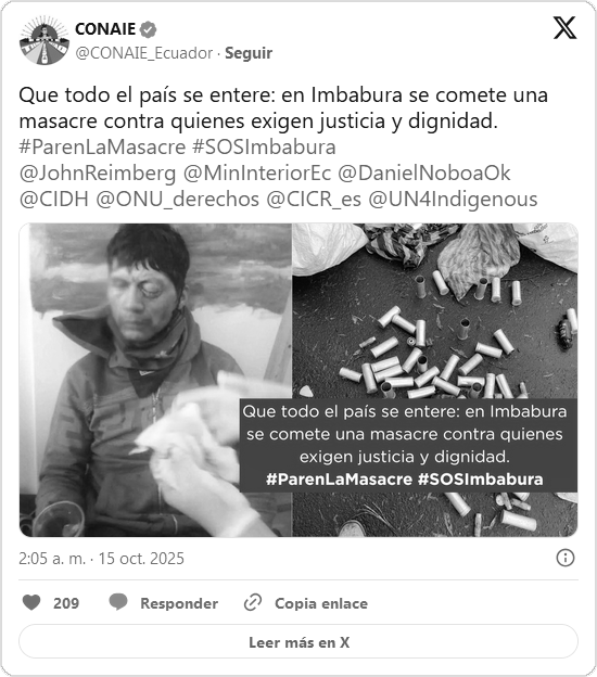 más temprano, la CONAIE realizó un comunicado denunciando la represión en el cantón Otavalo. En este sentido responsabilizó al Gobierno de Daniel Noboa, adjudicando que “ha convertido nuestras comunidades en zonas de guerra, utilizando gases, balas y violencia indiscriminada contra un pueblo que ejerce su derecho constitucional a la protesta”.