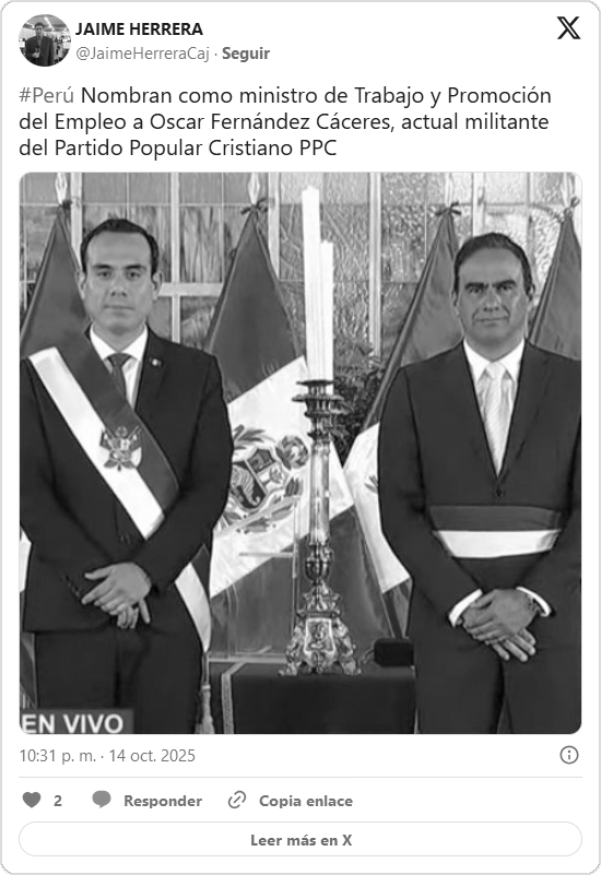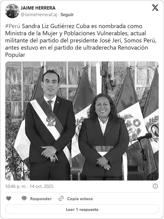 «Heredera del Movimiento Revolucionario Túpac Amaru (MRTA), la banda que quiere tomar por asalto a la democracia para controlar las elecciones de abril (de 2026) no representa la juventud que estudia y trabaja por un futuro», afirmó en septiembre el flamante primer ministro en su cuenta de X.