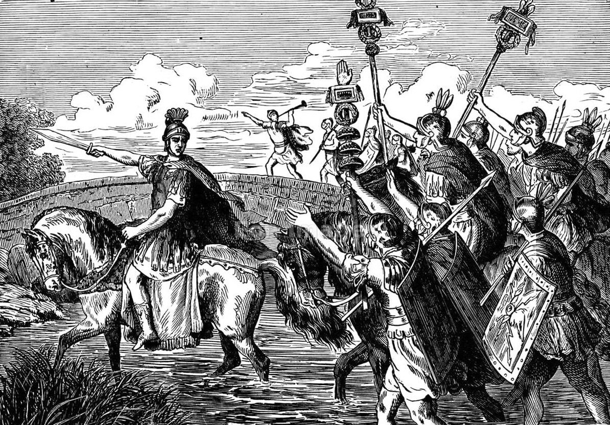 Según Suetonio, [Cayo Suetonio Tranquilo – historiador y biógrafo romano] César estaba aún dudando sobre qué hacer cuando apareció un hombre de extraordinaria belleza y altura, sin duda enviado por los dioses, que arrebató la trompeta a un soldado y tocándola con fuerza cruzó al otro lado. Este hecho hizo que César decidiera pasar el río, justificando su decisión en la voluntad divina y en la iniquidad de sus enemigos. A continuación, puso su destino en manos de la Fortuna con una frase que ha quedado para la historia: Alea iacta est, «la suerte está echada» o «los dados están echados». Para los romanos, la mejor tirada era la que llamaban «la suerte de Venus», y precisamente de esa diosa descendía la gens Julia, la familia de César.