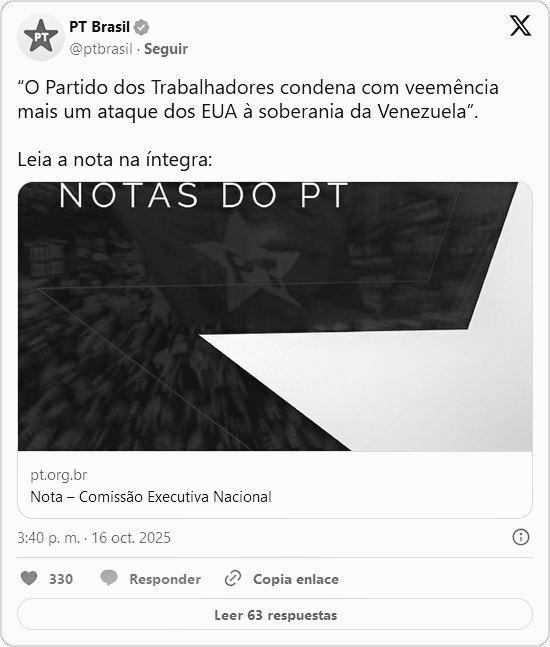 El Partido de los Trabajadores (PT) de Brasil emitió un comunicado condenando enérgicamente las recientes acciones de Estados Unidos contra Venezuela.