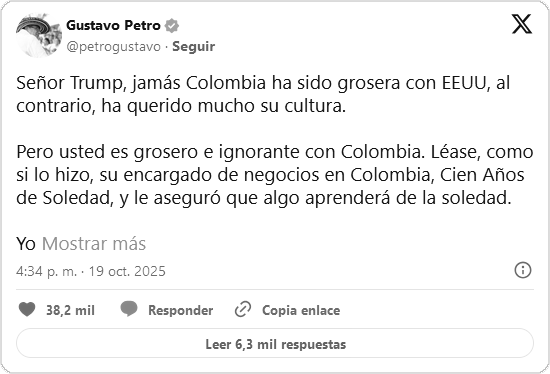 Frente a lo que calificó como un ataque ignorante, el colombiano señaló: “Señor Trump, jamás Colombia ha sido grosera con EE.UU., al contrario, ha querido mucho su cultura. Pero usted es grosero e ignorante con Colombia”. El jefe de Estado invitó a Trump a profundizar su conocimiento sobre el país, afirmando: “Léase, como si lo hizo, su encargado de negocios en Colombia, Cien Años de Soledad, y le aseguró que algo aprenderá de la soledad”.