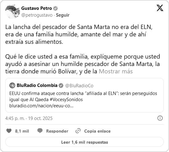 El punto más álgido de la respuesta de Petro fue la interpelación directa a Trump por la muerte del pescador Alejandro Carranza: “La lancha del pescador de Santa Marta no era del ELN, era de una familia humilde, amante del mar y de ahí extraía sus alimentos”, aclaró el mandatario, desmintiendo la supuesta naturaleza del objetivo.