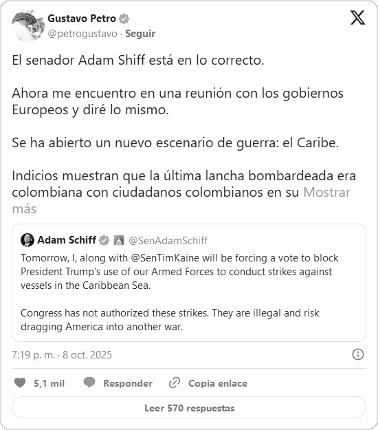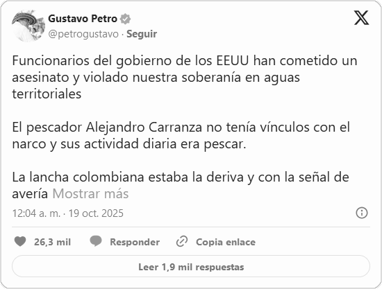 «Funcionarios del Gobierno de EE.UU. han cometido un asesinato y violado nuestra soberanía en aguas territoriales», publicó Petro en la red social X, indicando que la embarcación colombiana «estaba la deriva y con la señal de avería puesta al tener un motor arriba». «Esperamos las explicaciones del Gobierno de los EE.UU.», subrayó.