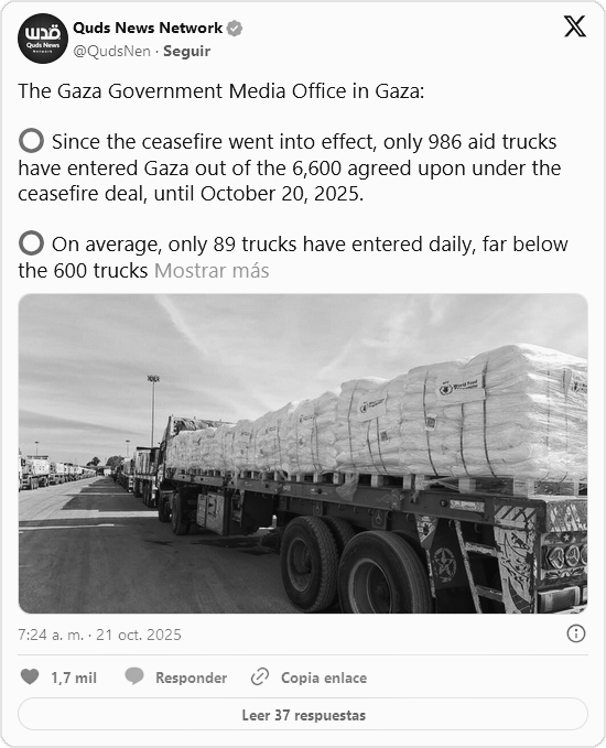 La Oficina de Prensa del Gobierno de Gaza informó que, desde la entrada en vigor del alto el fuego el 11 de octubre, únicamente 986 camiones de ayuda humanitaria han ingresado a la Franja de Gaza, representando apenas el 15 por ciento de los 6,600 camiones que debían llegar antes del 20 de octubre, según el acuerdo establecido.