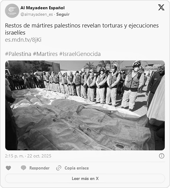 Según declaraciones recogidas por medios locales, los equipos médicos en Gaza identificaron mutilaciones, disparos a quemarropa y otras formas de maltrato en los cuerpos recuperados. Las víctimas, que fueron previamente reportadas como desaparecidas, habrían estado bajo custodia israelí o en zonas controladas por la ocupación antes de su muerte.