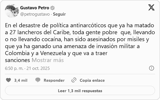 En un mensaje publicado en la red social X, el mandatario denunció los ataques recientes de Washington en el Caribe y una «amenaza de sanciones» en su contra. Aseguró que la política antinarcóticos estadounidense es un «desastre» que ya ha cobrado la vida de decenas de lancheros «pobres» en el Caribe, que «llevando o no cocaína han sido asesinados por misiles».