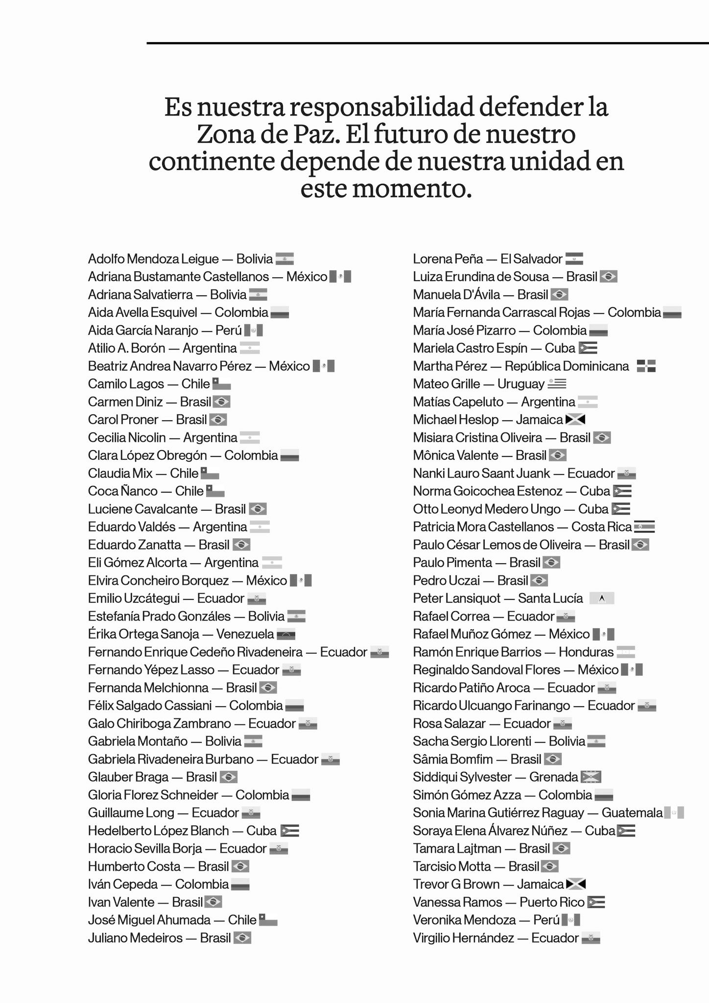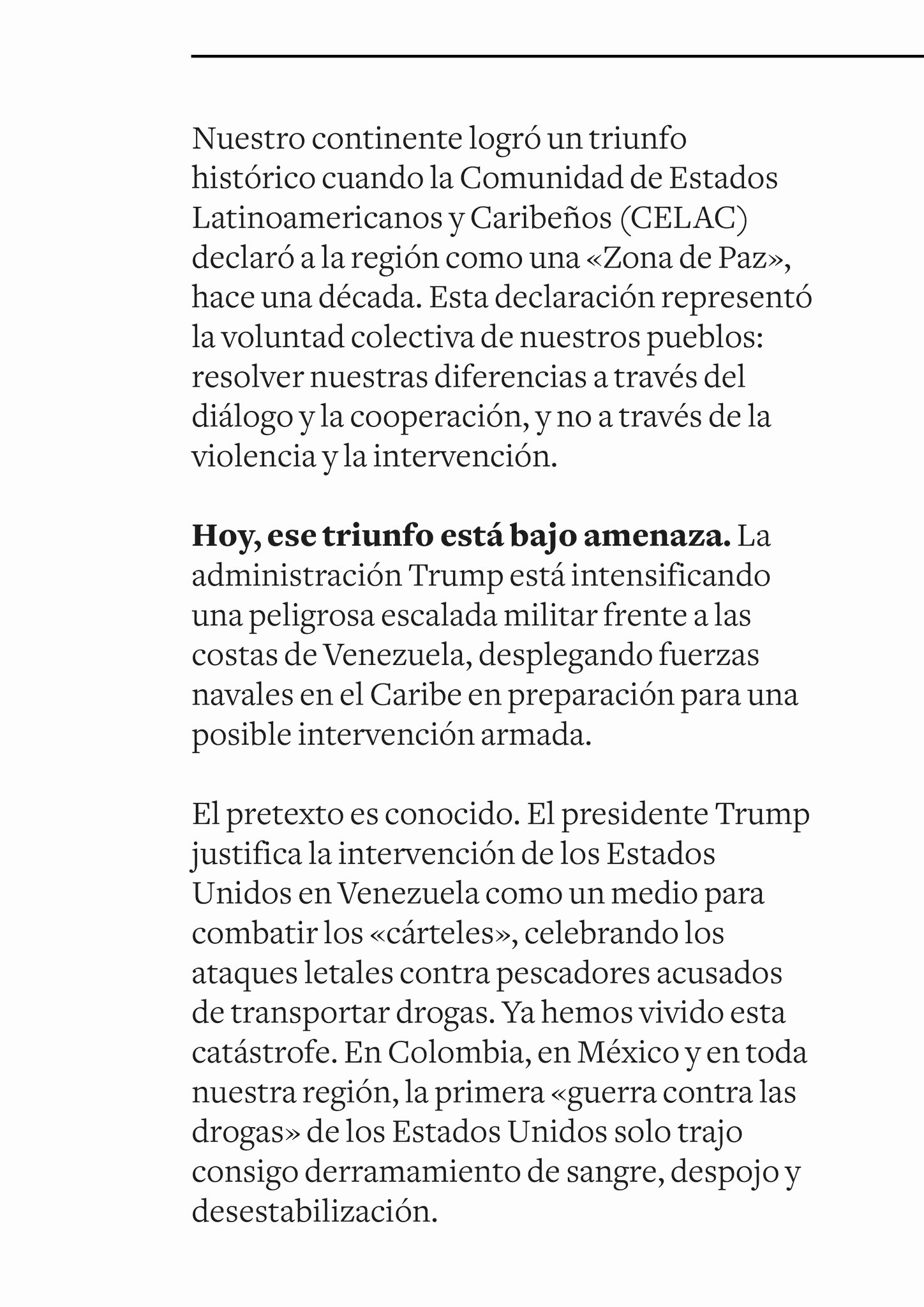 En el texto, se recuerda la proclamación de América Latina y el Caribe como “Zona de Paz”, adoptada hace una década por la Comunidad de Estados Latinoamericanos y Caribeños (CELAC). Según el Grupo de Puebla, este compromiso está en riesgo por el aumento de operaciones navales estadounidenses en el Caribe, promovidas durante la Administración del presidente Donald Trump.