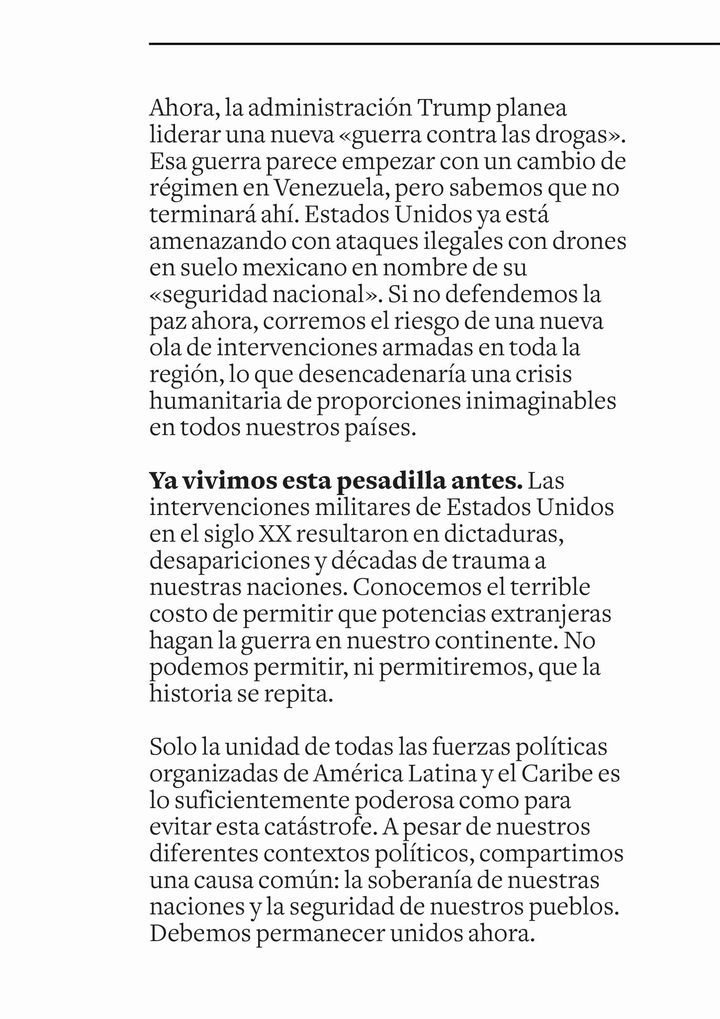 La declaración finaliza con un llamado a la unidad de las fuerzas políticas de América Latina y el Caribe para rechazar cualquier forma de intervención externa. El Grupo de Puebla afirma que la defensa de la soberanía nacional y la seguridad regional requiere una posición común, más allá de las diferencias políticas internas.