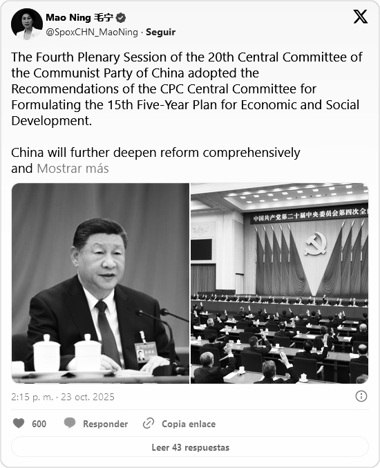De acuerdo con el comunicado oficial, el Comité Central ratificó plenamente el trabajo realizado por el Buró Político desde la última sesión plenaria. El informe destacó que China está próxima a cumplir los principales objetivos del XIV Plan Quinquenal (2021-2025), un periodo descrito como “trascendental y extraordinario” para el desarrollo nacional.