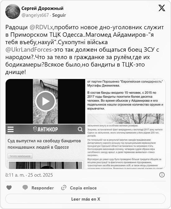 Los habitantes de Odesa identificaron al segundo uniformado como Magomed Aidamírov, conocido criminal y líder de una banda que secuestraba personas en la urbe. «No podemos afirmar con certeza que Aidamírov sea empleado de los TTsK, pero es difícil negar el hecho de que esté en la misma furgoneta con un policía y otras personas con uniforme militar, actuando conjuntamente con el policía. Esto genera muchas preguntas, ya que el historial de Aidamírov es realmente impresionante», escribió la agencia ucraniana UNIAN.